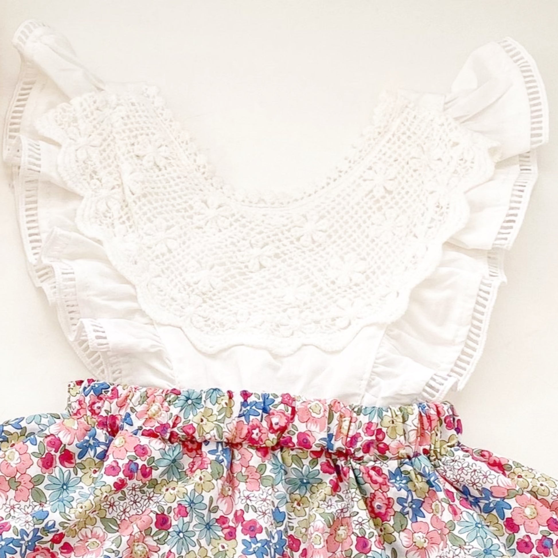 Dress your little one in charm and comfort with the Blossom Belle Set. Featuring a delicate white lace ruffle top paired with floral ruffle bloomers, this outfit is perfect for spring outings, playdates, birthdays, and casual celebrations. Paired with sweet pink shoes, it’s an ensemble that’s as stylish as it is comfy.