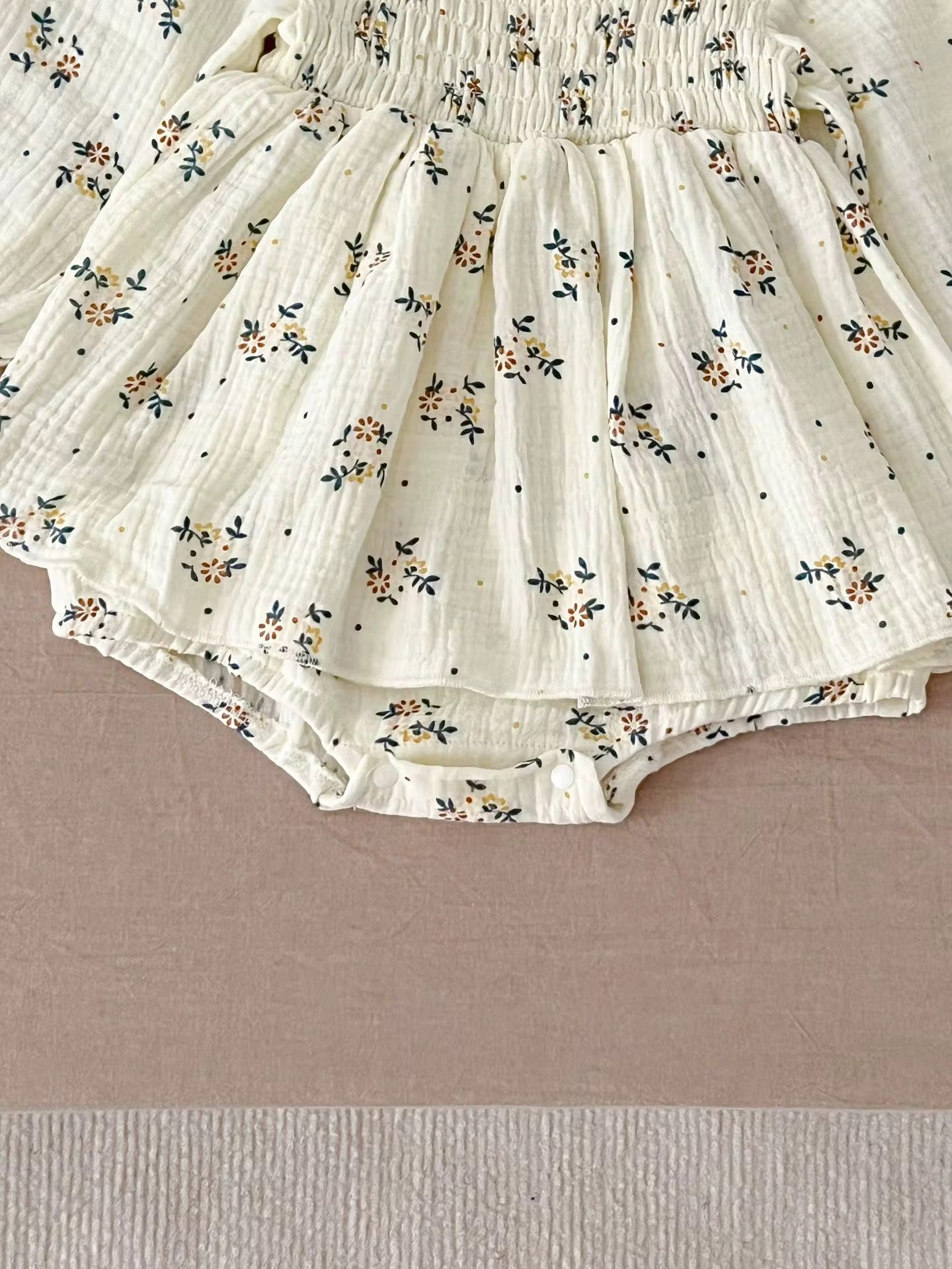 The smocked bodice and long puff sleeves add a touch of vintage-inspired style, while the attached bloomer bottom with snap closures ensures quick and easy diaper changes. A flowy skirt overlay completes the look, making it as practical as it is adorable.