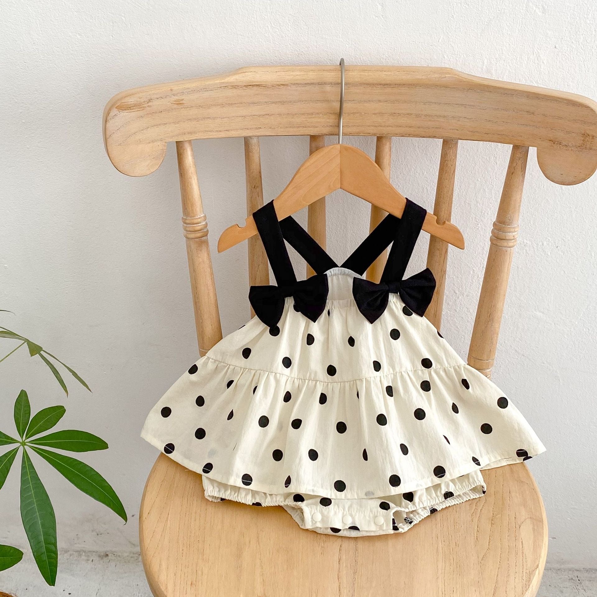 Our cotton polka-dot romper dress with pretty bow straps is the perfect mix of comfort and charm.